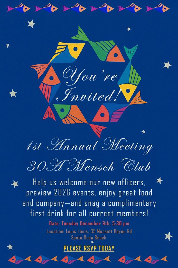 We’re excited to announce the First Annual Meeting of the 30A Mensch Club, and you’re invited to be part of this milestone evening! Join us at the always-fantastic Louis Louis restaurant as we come together to celebrate community, connection, and a great year ahead. This special gathering will include the installation of our new officers, updates and discussion about our 2026 events, and plenty of opportunities to reconnect with fellow members. Whether you’ve been with us every month or haven’t attended in a while, this is the perfect moment to jump back in. We’d love to see everyone’s faces around the table.